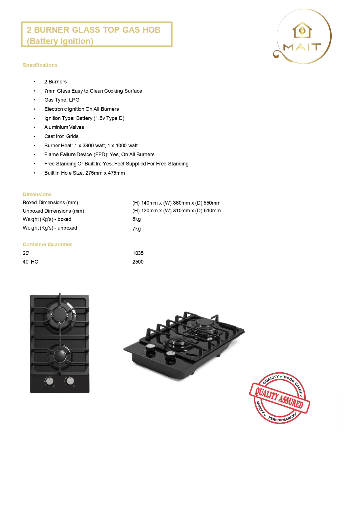 2 BURNER GLASS TOP GAS HOB (Battery Ignition)